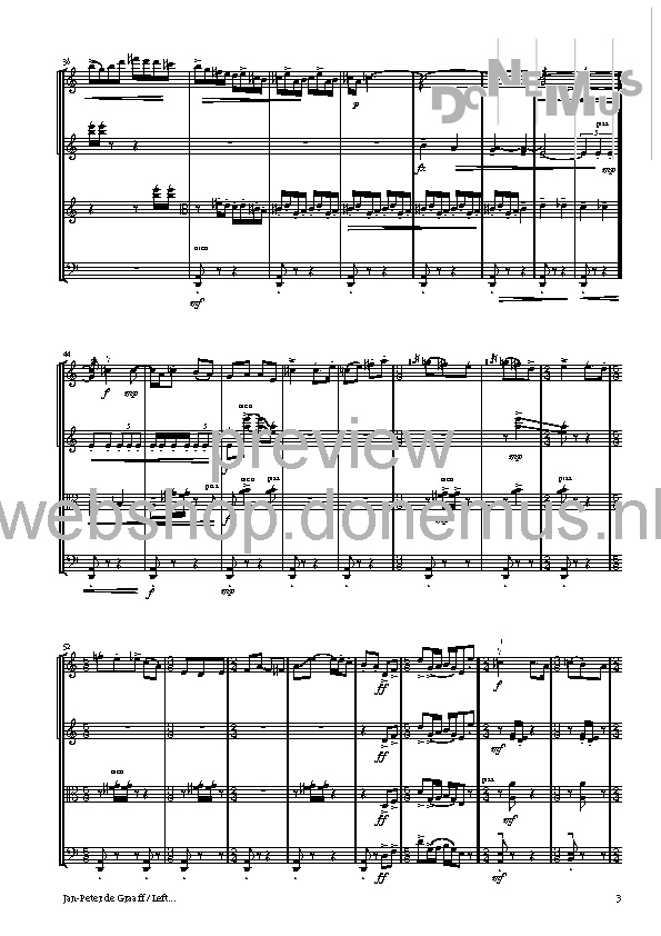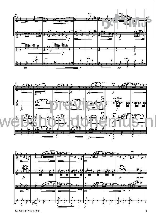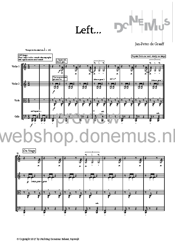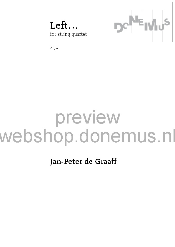 LEFT…, written especially for Festival Dag in de Branding (New music festival in The Hague), depicts the Werdegang of a march—a genre built on a persistent rhythm that is repeated many times, around which the other musical components move. In the first episode (the entire work consists of several episodes that seamlessly flow into one another), this rhythm is most clearly heard, and the surrounding sound is enriched by two additional quartets that, according to the composer, function as a Fernorchester (distant orchestra).